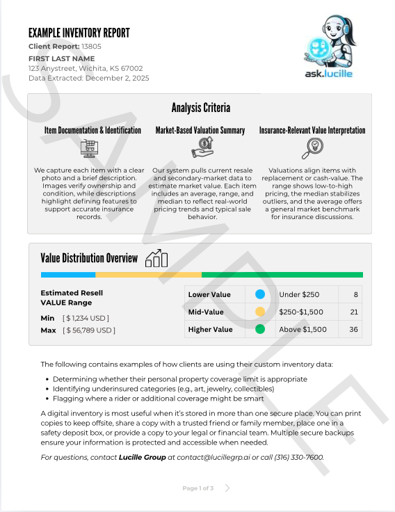 Download your inventory report as a PDF or a CSV file and share with family, adjusters or attorneys.